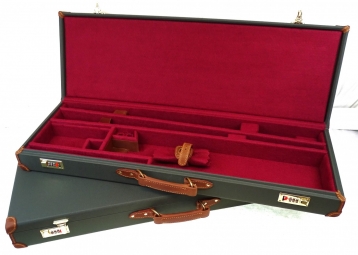 The Field case is also a sturdy wood constructed case, covered in a water resistant green cotton canvas with leather corners. The case has a leather carry handle, two brass combination locks and brass hardware. The case is lined with wool felt and has several European style accessory compartments.