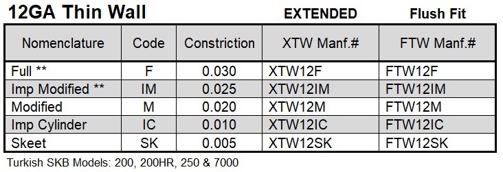 | XTW12M | Thin Wall Extended Choke Tube 12ga Mod |