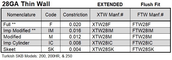 | XTW28M | Thin Wall Extended Choke Tube 28ga Mod |