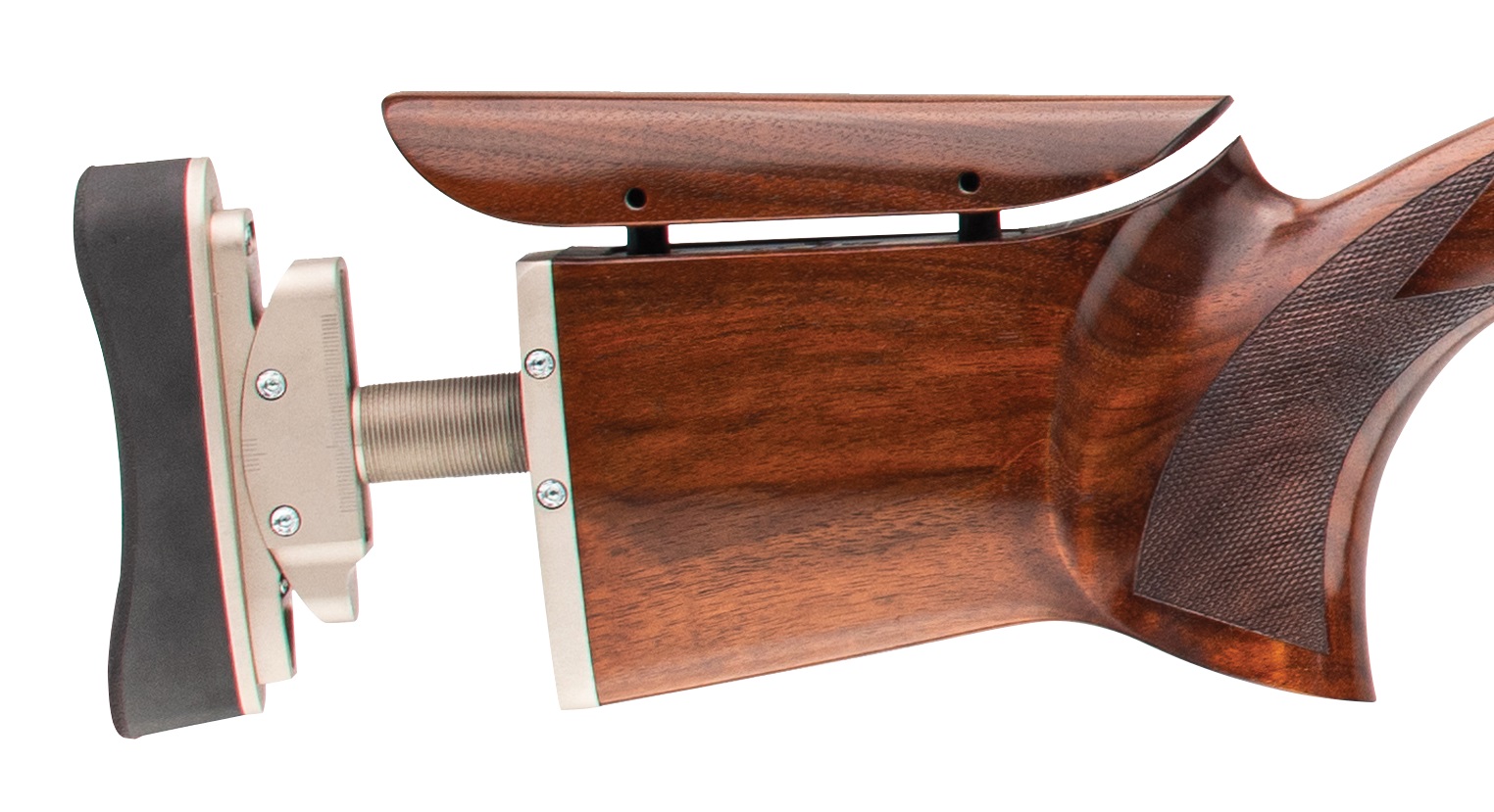 The adjustable comb and butt plate system ensure proper eye alignment and reduce felt recoil, enhancing overall shooting performance and comfort.